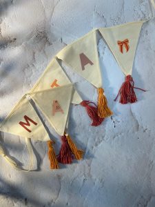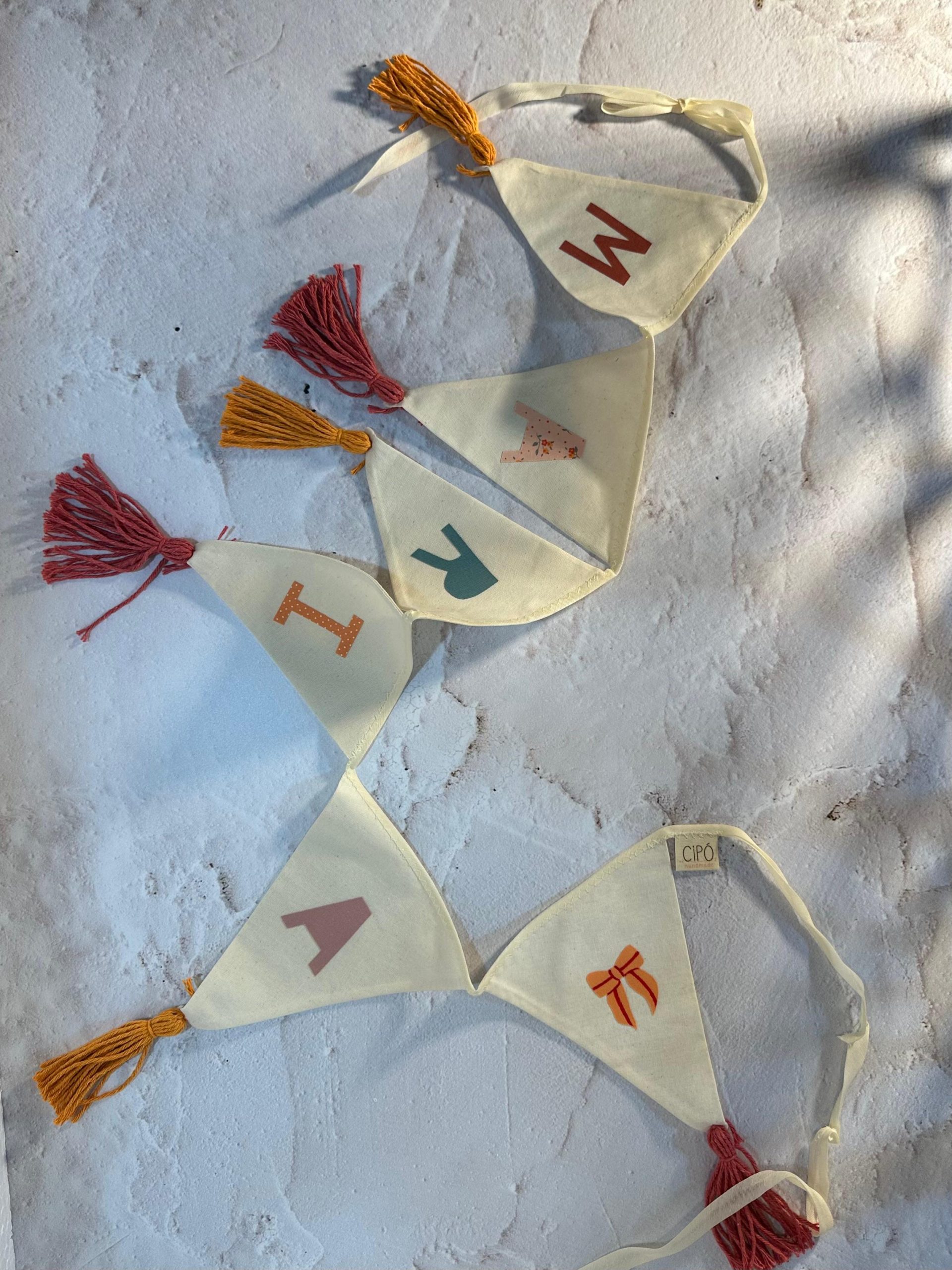 Bandeirola em tecido cru 100% algodão com nome pintado à mão. Na barra de cada bandeirinha,  penduricalhos coloridos feito em lã. Esse item é personalizado com o nome  e serve para decorar a festa e depois o quartinho da criança. Um produto super exclusivo e atemporal.