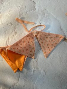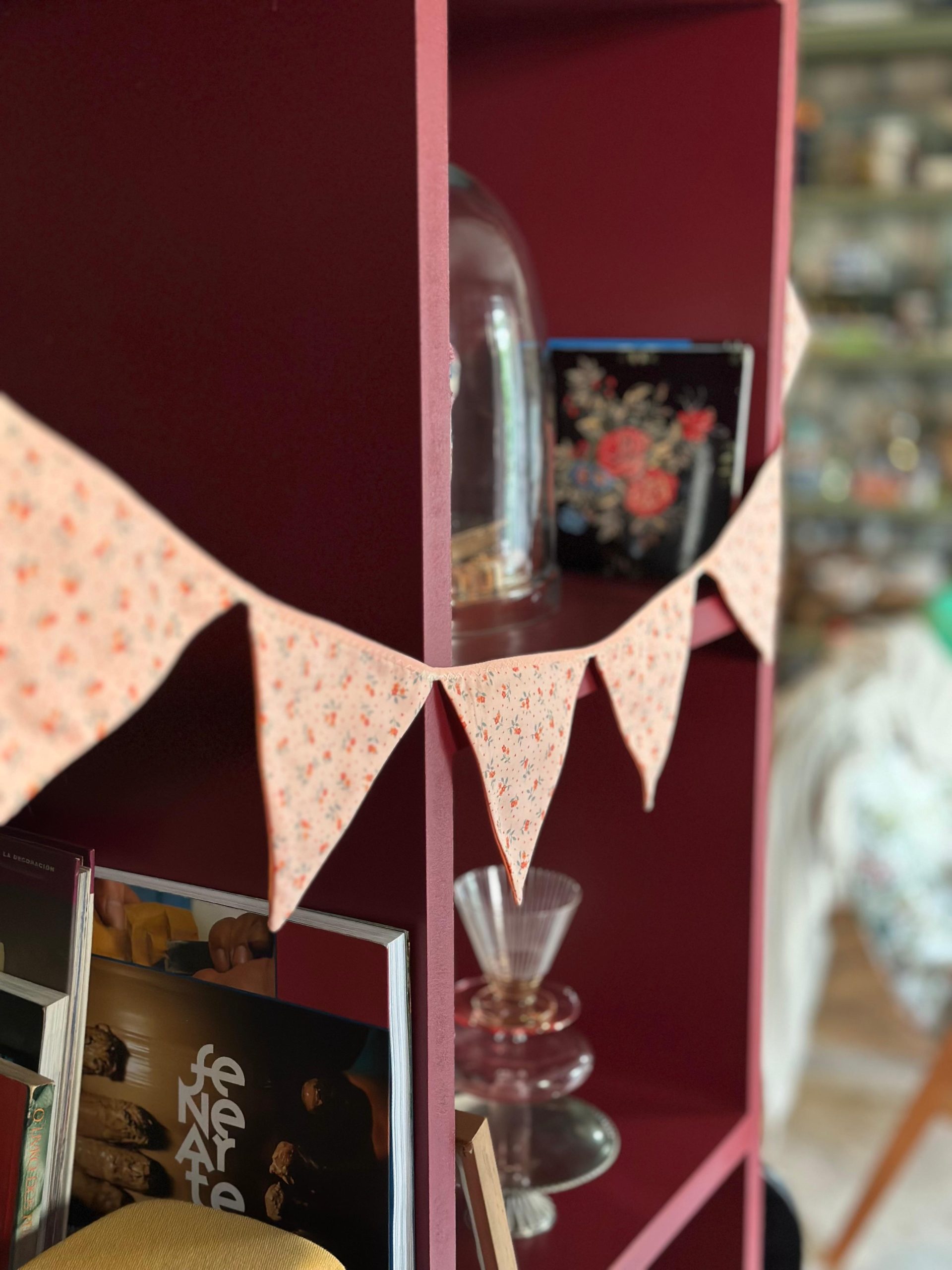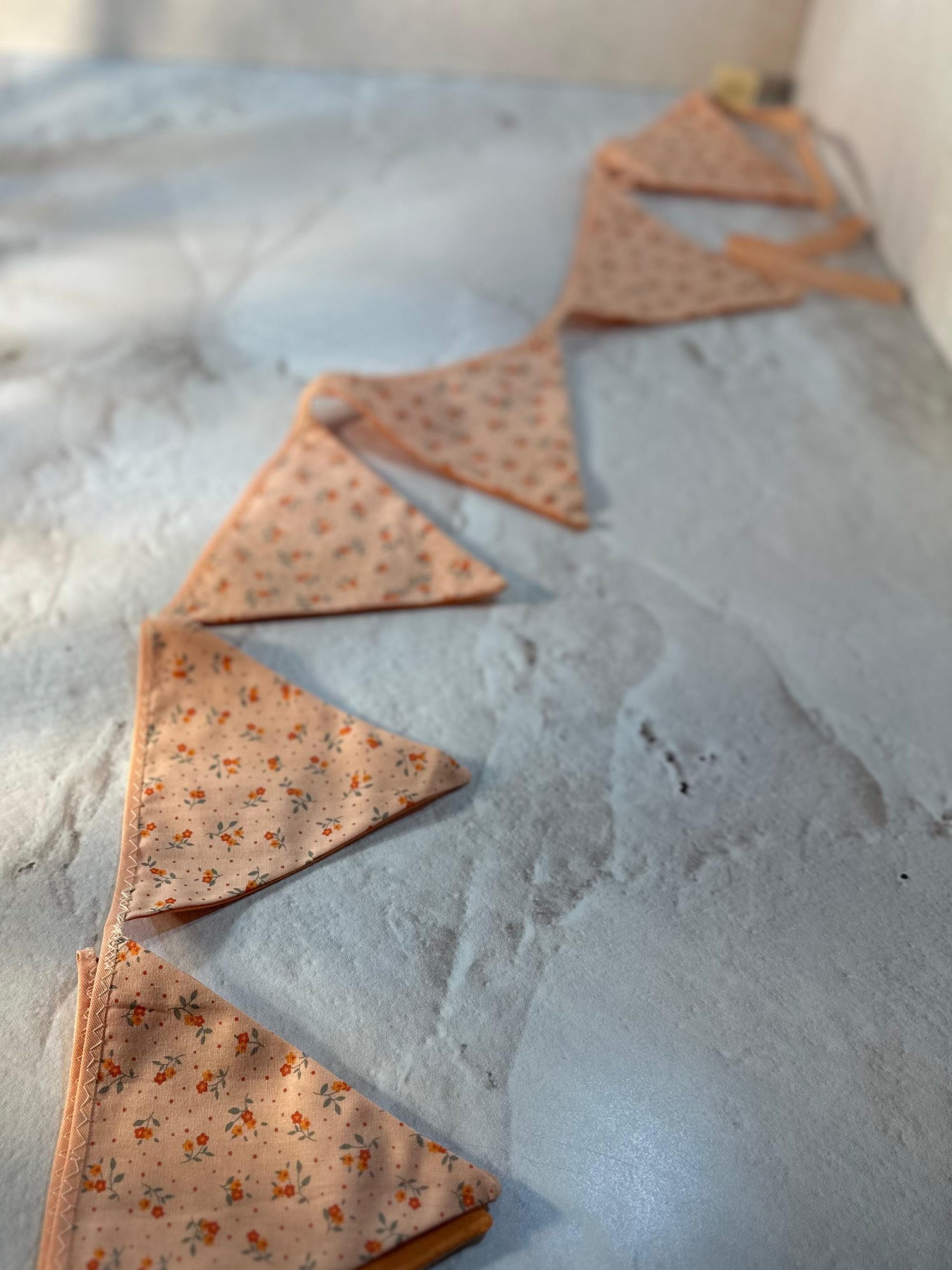 Varal de bandeirinhas feitas em tecido de algodão com estampa floral.