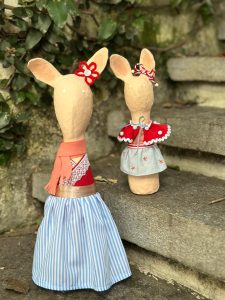 Coelhas feitas com a técnica papietagem(papel,cola caseira e tinta) e roupinhas em tecido. Foram pintadas à mão e as roupinhas confeccionadas especialmente para elas.