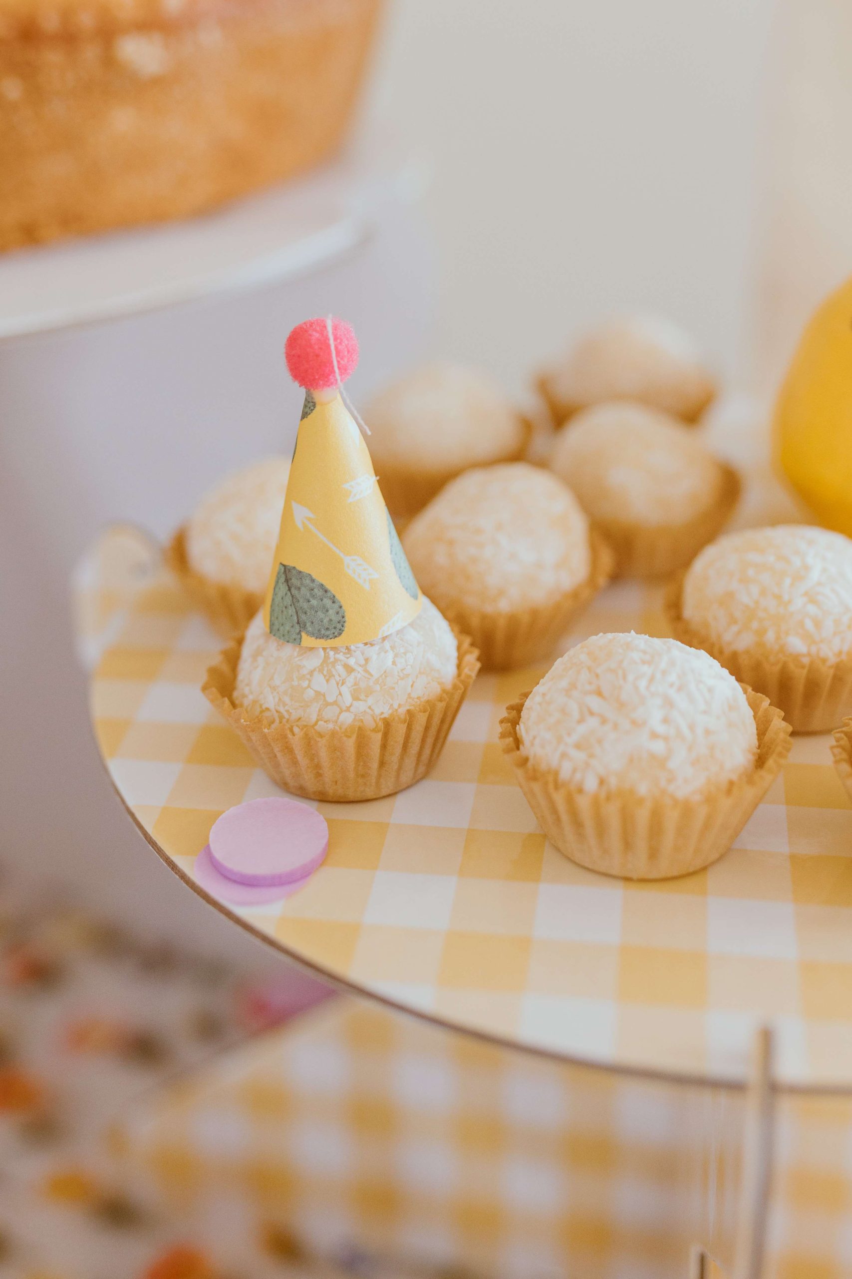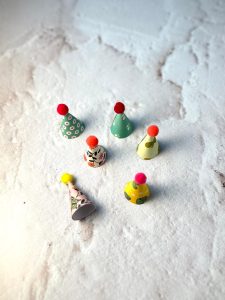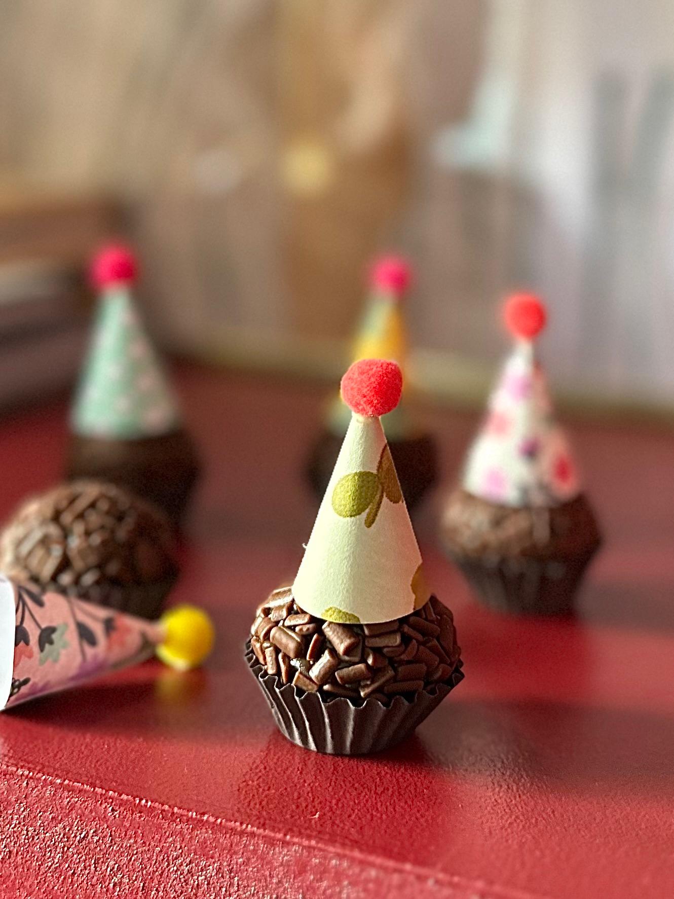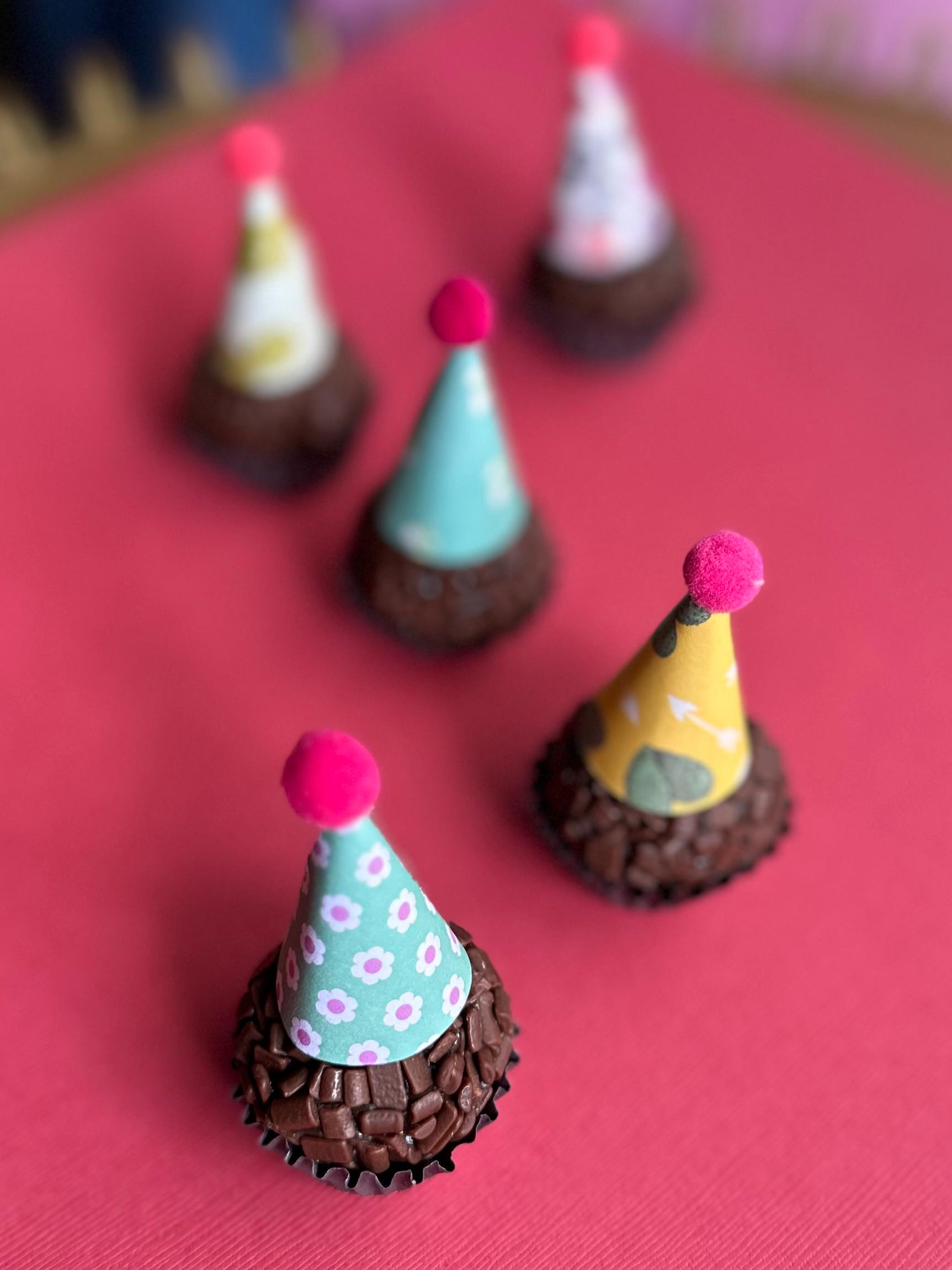 Kit com 5 mini chapéus feito em papel estampado com pompom na ponta para enfeitar docinhos de festa.